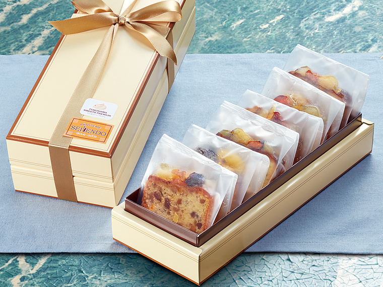 福島産の桃、梨、りんご、いちご、ぶどう、キウイなど、果物をふんだんに使った贅沢なパウンドケーキ。ひと口食べれば、洋酒の芳醇な香りがいっぱいに広がり、ホロリと口溶けの良い生地の中からフルーツが次々と現れる。
