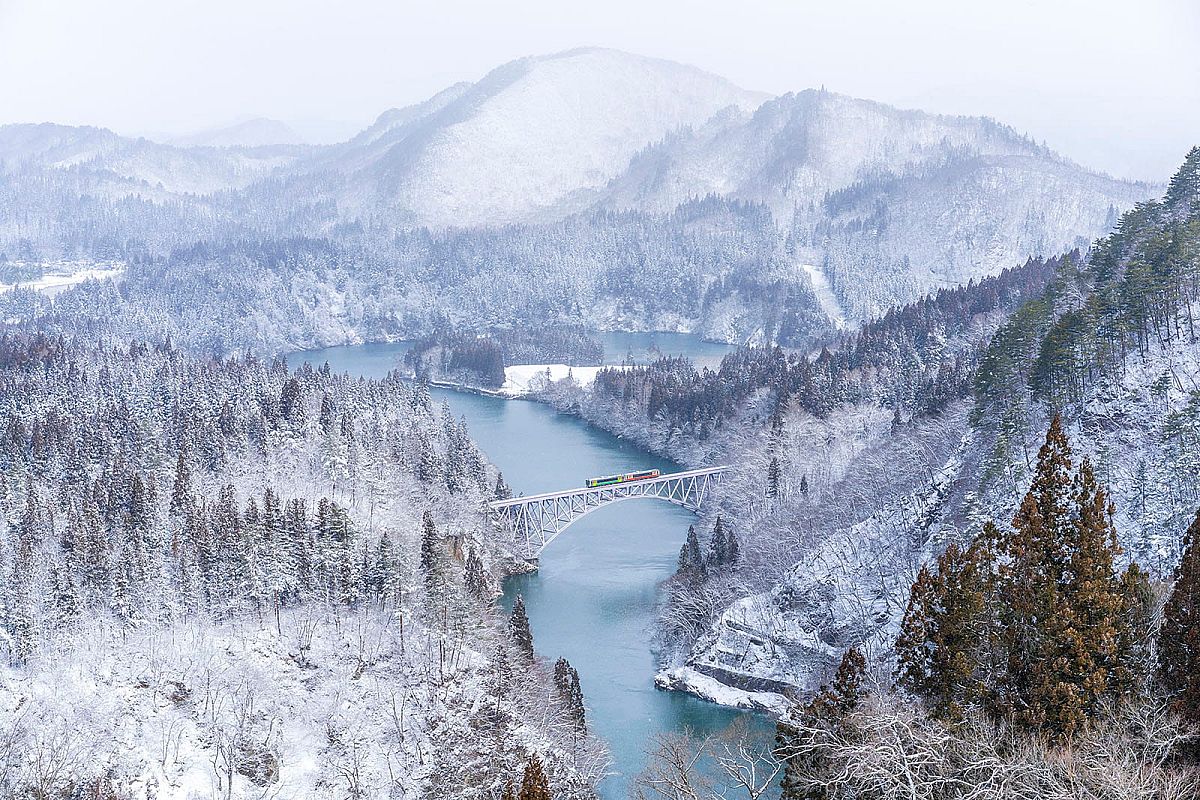 Among the scenery along the JR Tadami Line, which runs beside the Tadami River, the First Tadami River Bridge in Mishima Town is especially popular and is one of the iconic views of the Oku-Aizu region. Surrounded by deep valleys and mountains, the sight of a train slowly crossing the steel bridge is truly memorable. It can be viewed from an observation point within walking distance of the roadside station “Oze Kaidō Mishima-juku”, with winter’s snow-covered mountains offering a particularly stunning view.