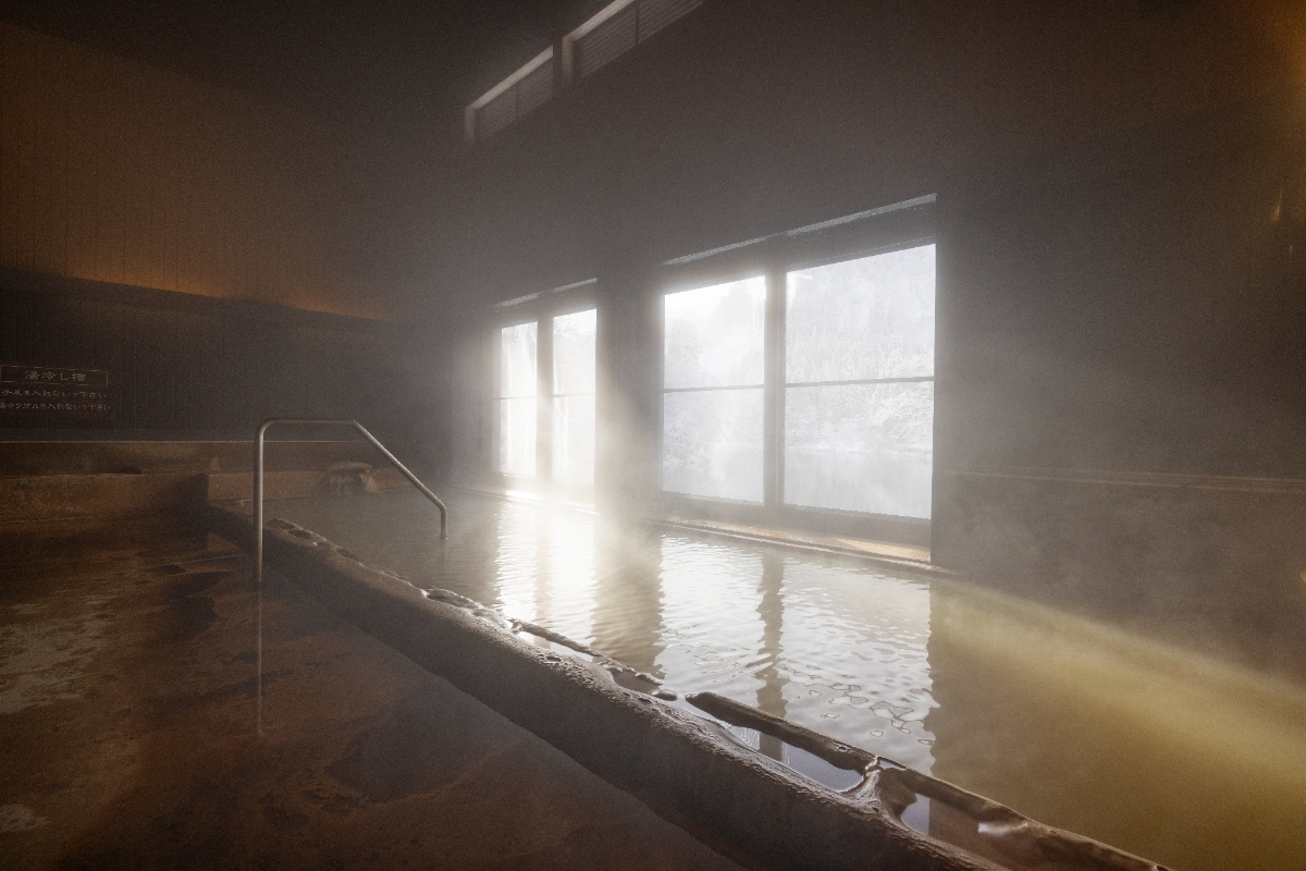 A.駐車場から見えるエレべーターが3階に位置していて、下った1階に受付や休憩室、男女別の大浴場と露天風呂があります。大浴場から四季折々の只見川を望むこともできますが、露天風呂から目の前に広がる絶景をぜひ一度ご覧いただきたいです。このほか個室休憩室(有料)も備えています。湯治客向けの宿泊湯治棟には、自炊施設があり長期滞在も可能です。日常を離れ朝な夕なにのんびりと薬湯に浸かる日々を過ごせば、心も体も癒され活力が湧いてくることでしょう。