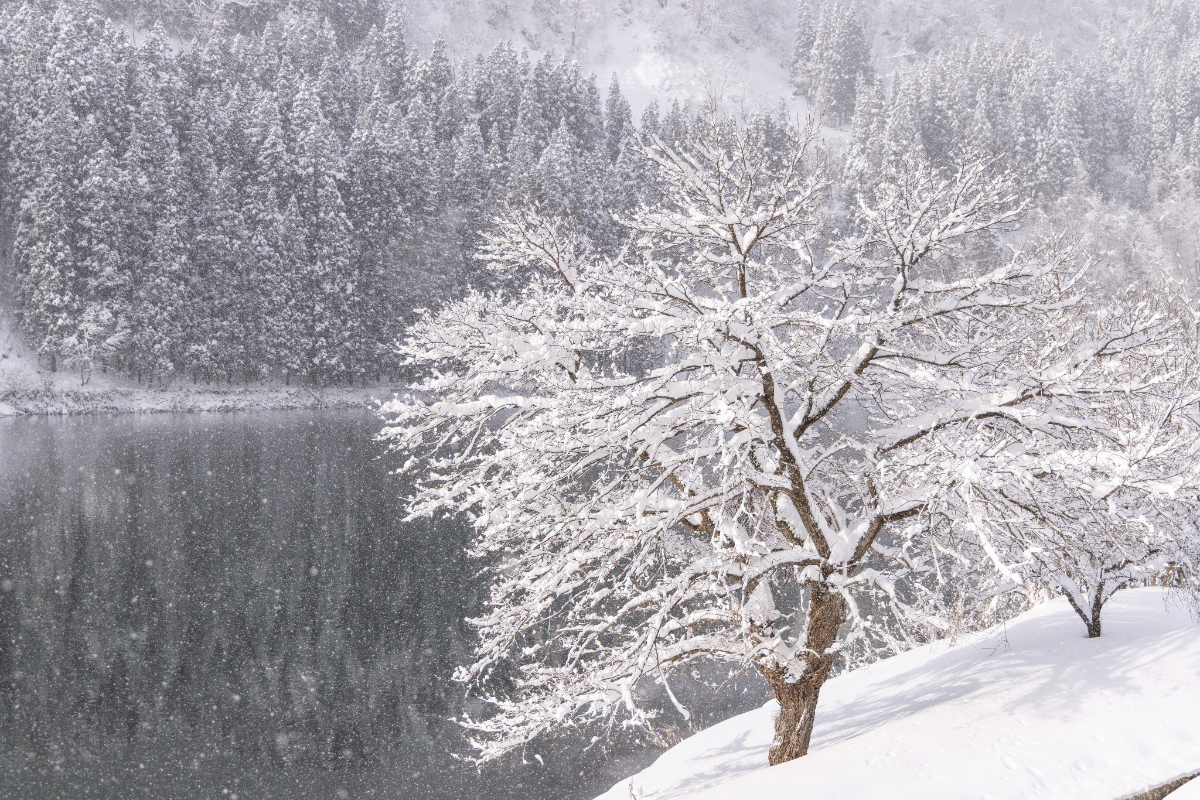 しんしんと雪が降り積もる冬の奥会津。早戸温泉から眺める只見川や山々も白い雪に覆われます。絶景を愛でながら、天然の薬湯に浸かることができるつるの湯。支配人の五十嵐さんはじめスタッフの皆さんが、寒い冬も心あたたまる笑顔でお客さまをお出迎えします。
