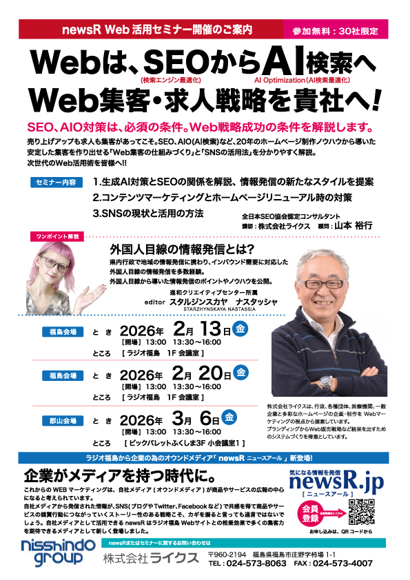 - 「第1回newsR Web活用セミナー」を開催しました。ご参加誠にありがとうございました。(ラジオ福島)- 2026.02.14(土) 11:05