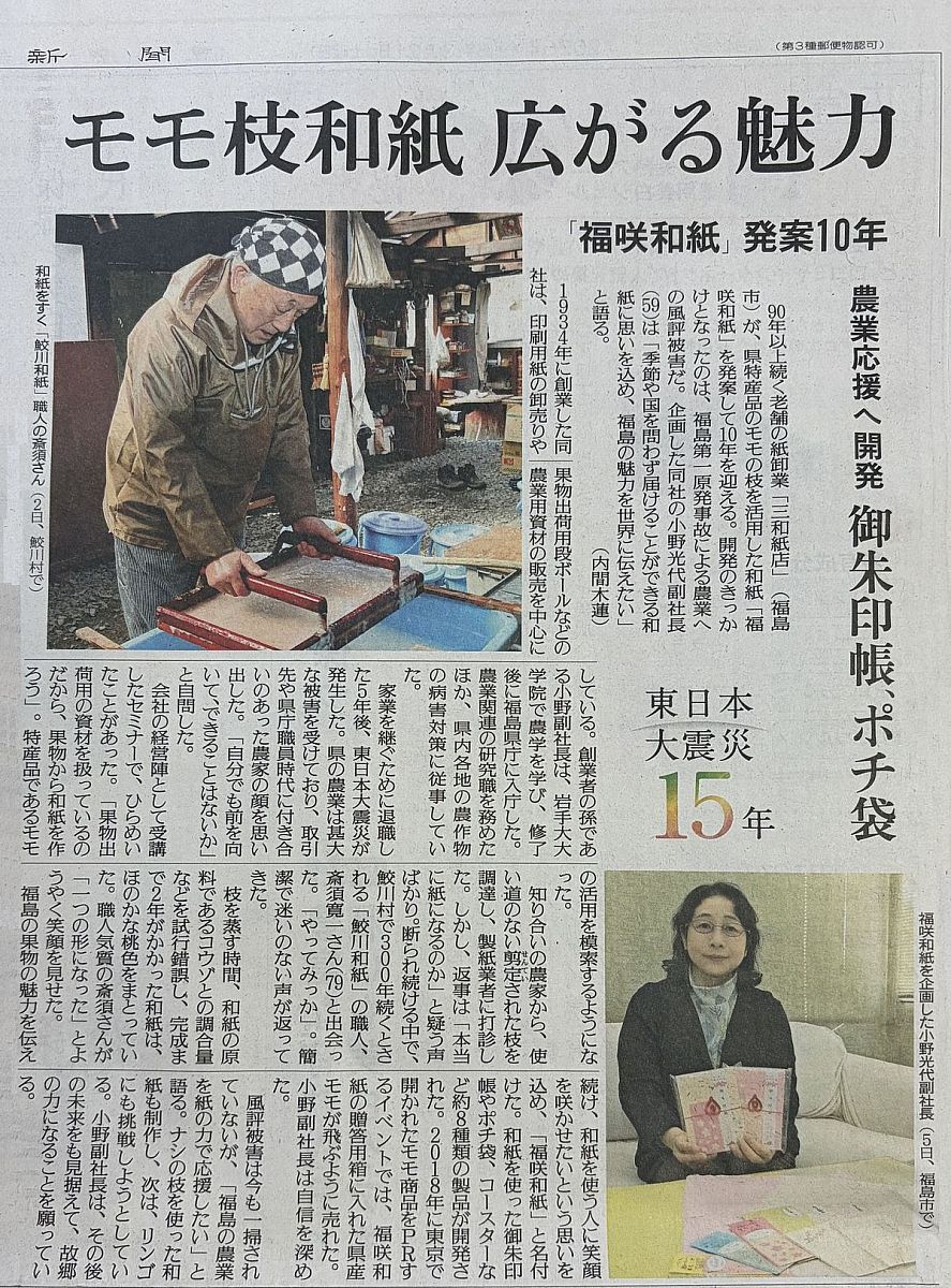発案から10年、モモの枝や幹から生まれた「福咲和紙」が読売新聞で紹介されました【三和紙店】