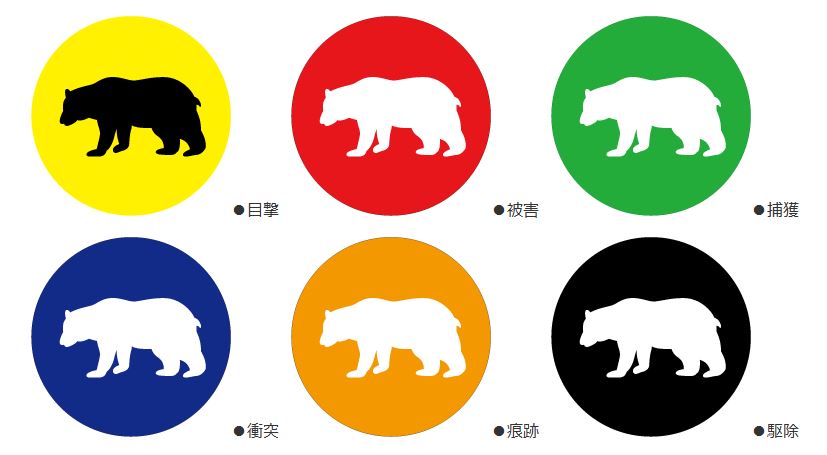 ●マップへのプロット記号を「目撃」「被害」「捕獲」「衝突」「痕跡」「駆除」の6種類にいたします。