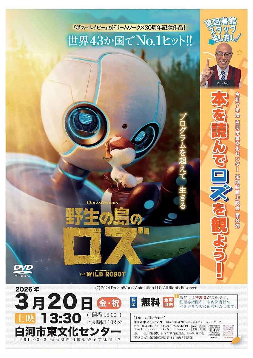 - 3月20日、定期映画上映会第8弾!「野生の島のロズ」を開催します!【白河東文化センター】(Postbox-newsR Provided by Like-s)- 2026.03.13(金) 07:30