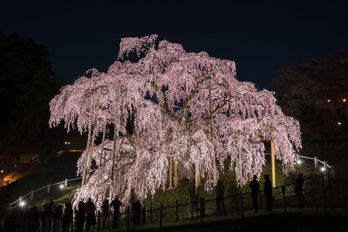 Miharu Takizakura is one of Japan’s three most famous cherry trees and is said to be over 1,000 years old. It is designated as a National Natural Monument. Standing before it, I felt small beside a tree that has quietly witnessed centuries of history. As I looked at its branches cascading like a waterfall and the pale blossoms swaying softly in the air, I felt a gentle sense of calm and knew I wanted to return someday. Because it is such a popular “hanami” spot, it can be difficult to take photos alone during the day because of the crowds. Even so, the grounds are well maintained, and when I visited, many food stalls lined the area.