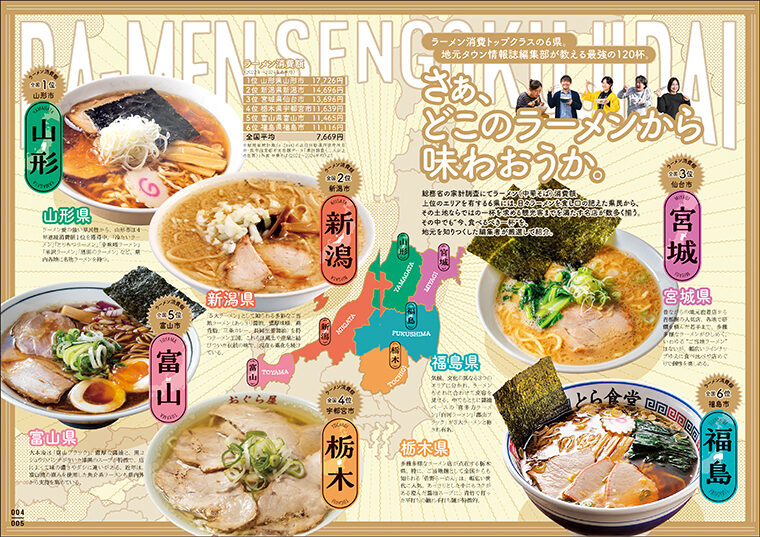 総務省の家計調査「ラーメン(中華そば)消費額ランキング」で上位の6地域(福島・山形・宮城・新潟・栃木・富山)のタウン誌が結集。