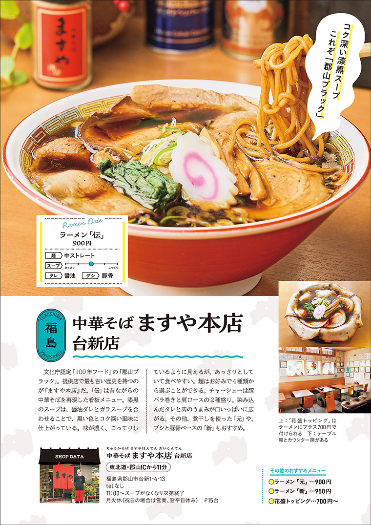 福島県は「喜多方ラーメン」「白河ラーメン」「郡山ブラック」の“福島3大ラーメン”をはじめ、「会津山塩ラーメン」「西会津味噌ラーメン」など、様々な一杯を紹介。