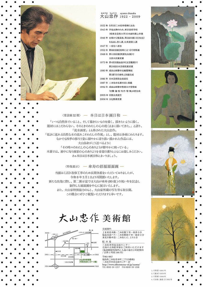二本松市の大山忠作美術館は、LED改修工事による長期休館を終え、令和8年3月1日(日)より再オープンいたしました。現在、常設展32期「本日は日本画日和」を開催中です。また新たな出発に際し、第二展示室では特集展示「傘寿の招福扇面画」も実施しています。この機会にぜひご観覧いただけますと幸いです。