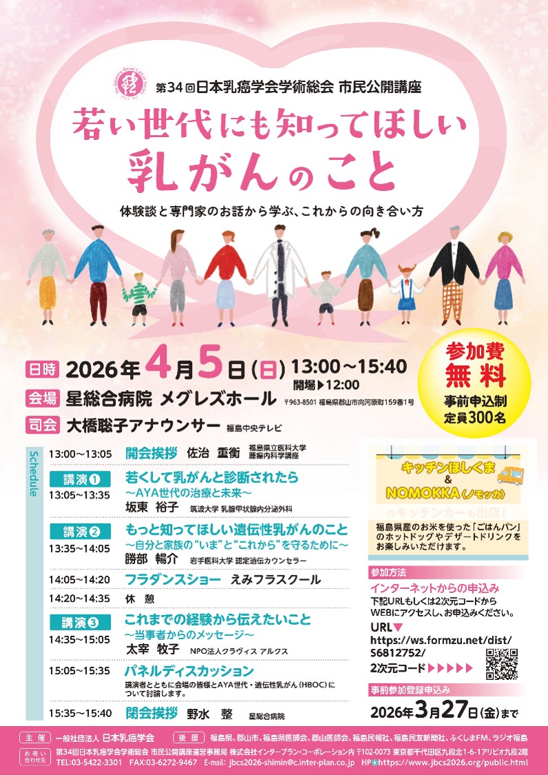 - 第34回日本乳癌学会学術総会 市民公開講座「若い世代にも知ってほしい乳がんのこと」4月5日開催(第34回日本乳癌学会学術総会 市民公開講座)- 2026.03.13(金) 00:15