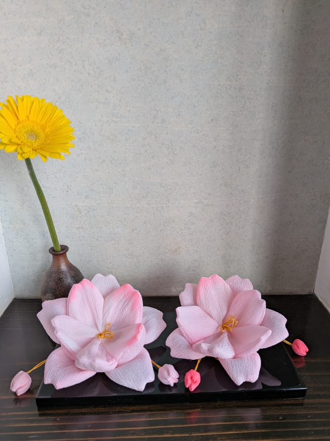 私は着ることもなくなったので少しづつ処分していて、腰紐で手のひらサイズの桜を作ってみました。