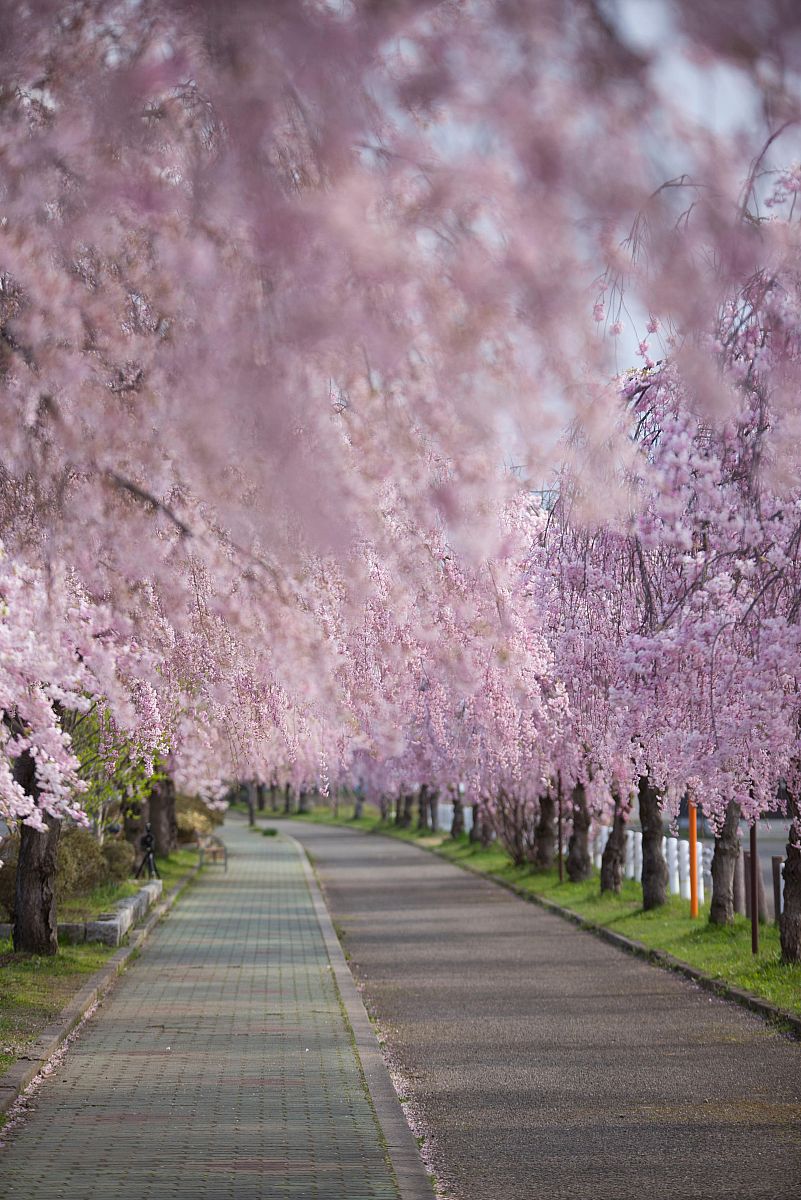 The “Nicchū Line Weeping Sakura Line” in Kitakata City is a walking path created along the former site of the Japan National Railways Nicchū Line. For about 3 kilometers, around 1,000 weeping cherry trees (mainly "Yaebeni-shidare" and "Beni-shidare" varieties) line the path. In spring, their branches hang down and bloom from both sides of the walkway. When the trees are in full bloom, it almost feels like walking through a tunnel of cherry blossoms. It’s a lovely place to take a slow stroll and stop for photos along the way.