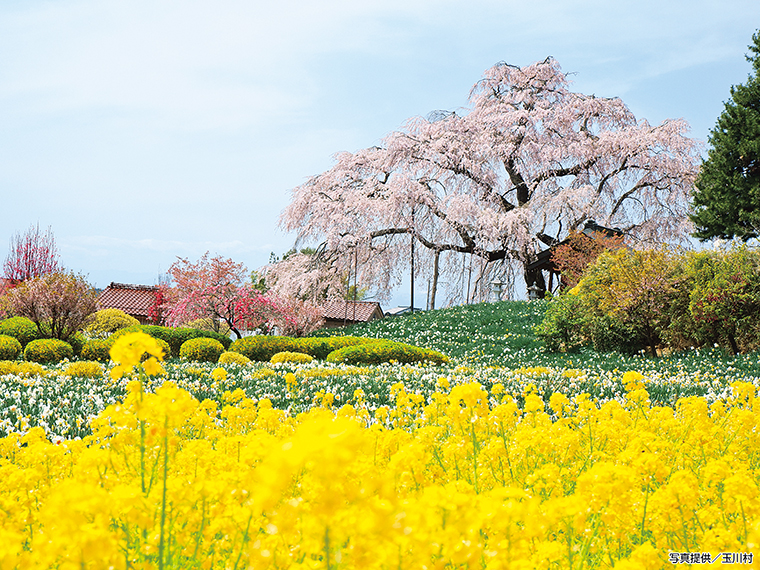 樹齢300年、個人宅に優雅に咲くベニシダレザクラ。玉川村の『金毘羅(こんぴら)桜』は天明・天保の大飢饉の後、金毘羅詣りの記念樹として植樹された。敷地内に咲くスイセンや菜の花とのコラボも美しい。