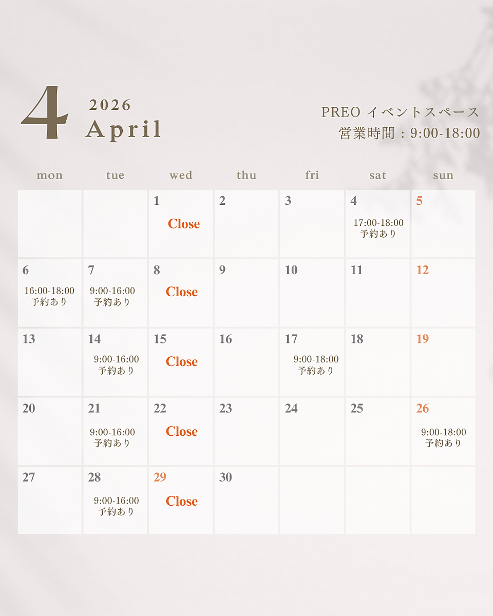 - 【4月】PREOイベントスペースご利用予約状況のご案内(プレオ)- 2026.04.04(土) 12:22