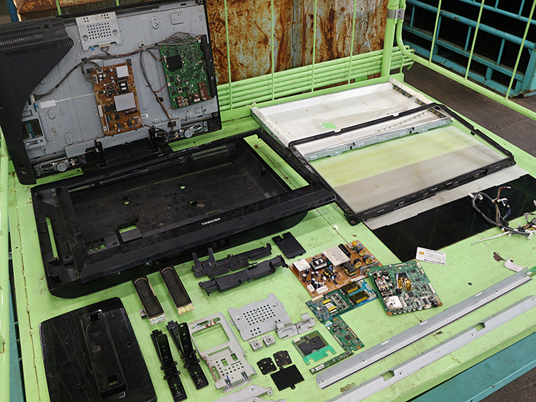 会社の紹介を聞いた後に、工場の中を見学しました。家庭にありそうな家電がずらり。大きな洗濯機がここまで細かくなるのかと感心しました。車は年間7,000台程度解体しているそうです。
