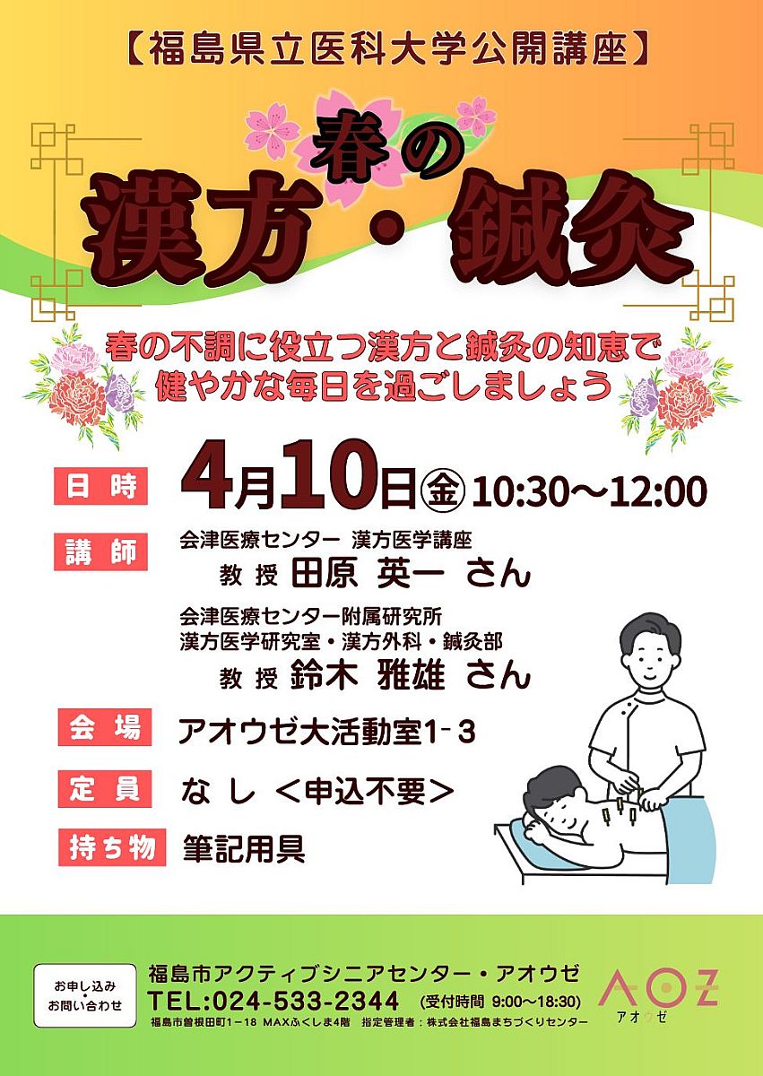 公立大学法人福島県立医科大学は、福島市アクティブシニアセンター・アオウゼにおいて、県民の皆様の健康増進を目的とした公開講座「春の漢方・鍼灸」を開催いたします。本講座では、季節の変わり目に見られる体調の変化について、漢方および鍼灸の考え方をもとに整理し、日常生活における体調管理の一助となる情報を、専門家がわかりやすく解説します。なお、本講座は一般的な健康情報の提供を目的とするものであり、特定の治療法の効果・効能を示すものではありません。