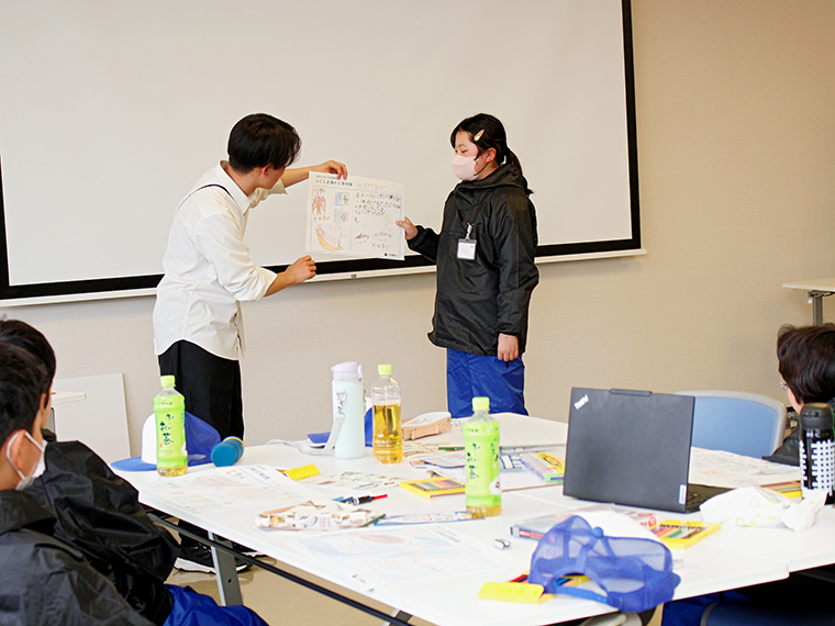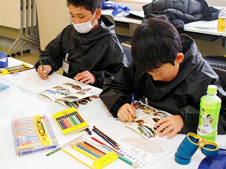 ここで一旦、午前の部のまとめをします。1番印象に残っていることを絵や文章で1枚の紙にまとめ、発表をしました。市場で見つけた珍しい魚、ヒラメとカレイの見分け方、魚の大きさや触った感触、安心安全な魚が自分たちの元へ届く過程など、実体験を踏まえた発表となりました。