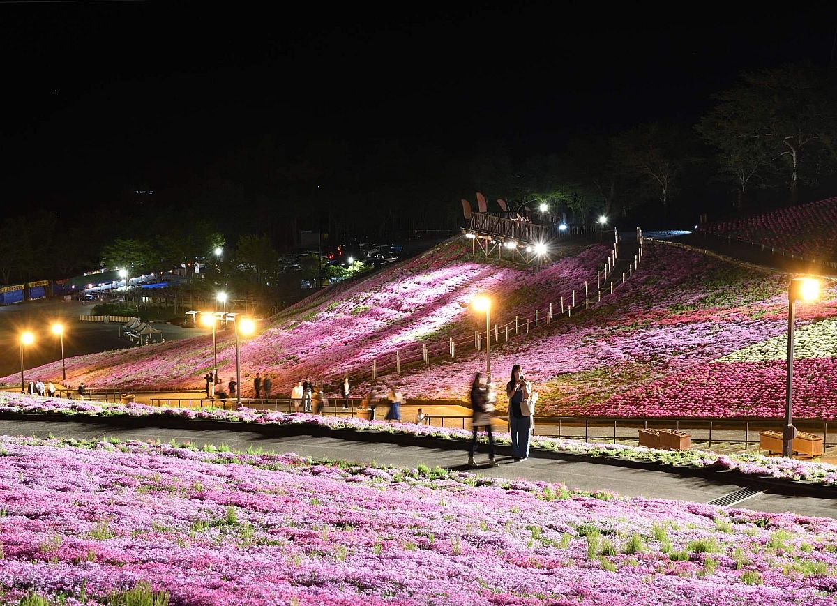 When I asked about highlights of the “Shibazakura Festival,” one experience specifically stood out: being immersed in a “carpet of flowers”. Mr. Yoshida said that walking along the narrow paths feels like moving through a sea of flowers. There’s also a wide range of activities, such as holiday live music and street performances (included in the admission fee), and various food trucks. At the highest point in the park, you can stop by “Sky Cafe 634” (named for sharing the same height as the 634m “Tokyo Skytree”), and enjoy an ice cream while taking in sweeping views of “Ju-peer Land Hirata”. In the evening, the illumination creates a completely different atmosphere. “Usually, cherry blossoms are lit from below (‘light-up’ in Japanese), but moss phlox is illuminated from above — so you could call it ‘light-down’”, says Mr. Yoshida with a smile.