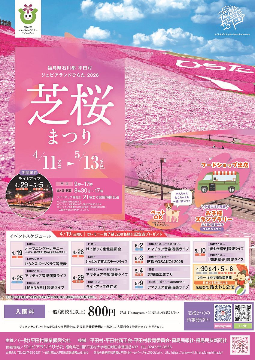福島県石川郡平田村は、高原野菜、激辛ハバネロや自然薯で知られていますが、この季節に特に注目されるのが「ジュピアランドひらた」というレジャー施設です。村のシンボルである蓬田岳のふもとに広がる自然豊かな森林公園で、今の時期は園内をなんと約26万株の芝桜が彩ります。例年4月下旬から5月中旬にかけて「芝桜まつり」が開催され、ピンクの花々が一面に咲き、まるで花の海のような華やかな景観を満喫できます。絶景スポットとして有名で、多くの人が写真撮影に訪れます。期間中は園内で音楽ライブや飲食の出店があり、お子様向けのスタンプラリーも実施されており、家族で楽しめる催しが充実しています。さらに、満開の時期には夜のライトアップも行われ、昼間と違う雰囲気の花畑を満喫できます。