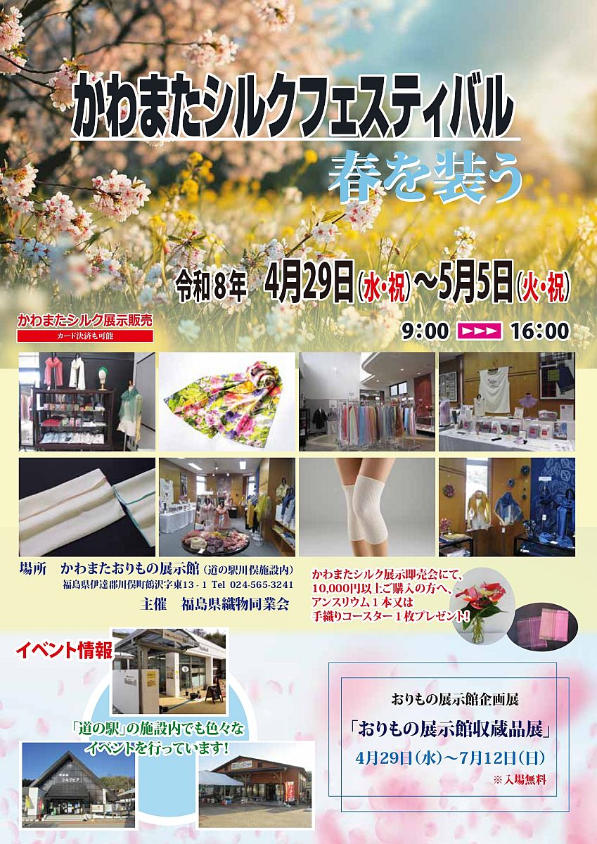 川俣町の「道の駅かわまた」内にある「かわまたおりもの展示館」では、令和8年4月29日(水・祝)から5月5日(火・祝)まで、川俣シルクの展示即売「かわまたシルクフェスティバル」を開催します。