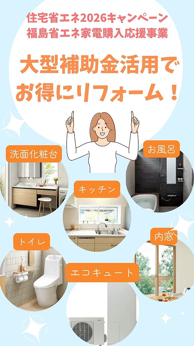 「どうせなら光熱費全体を見直したい」「補助金やポイントを上手に組み合わせたい」といったご要望にも、住宅省エネ2026キャンペーンの情報とあわせて丁寧にご説明いたします。福島県の省エネ家電キャンペーンでポイント2倍になるこの機会に、家電の買い替えと住まいの省エネ計画を一緒に考えてみませんか。