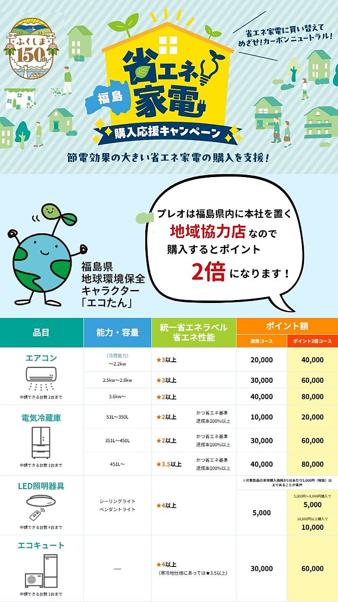 福島県省エネ家電購入応援キャンペーン|プレオならポイント2倍の地域協力店です