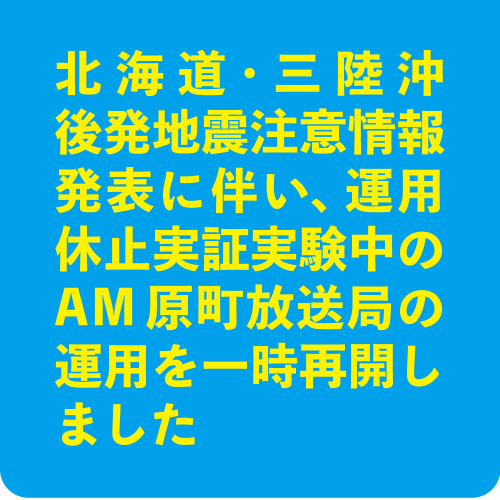しかし、4月20日に発表された「北海道・三陸沖後発地震注意情報」発表を受け、相双地域の住民の皆様に情報が伝わらないと身の危険が生じる可能性があると判断し、AM原町放送局(801kHz)の運用を一時的に再開する判断を致しました。期間は注意情報の有効期間内で、4月21日午前11時25分から放送を一時再開しました。