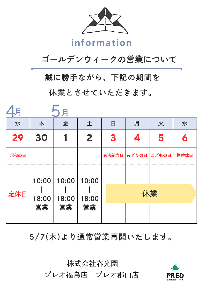 - 2026年ゴールデンウイーク期間の休業日について(プレオ)- 2026.04.26(日) 12:27
