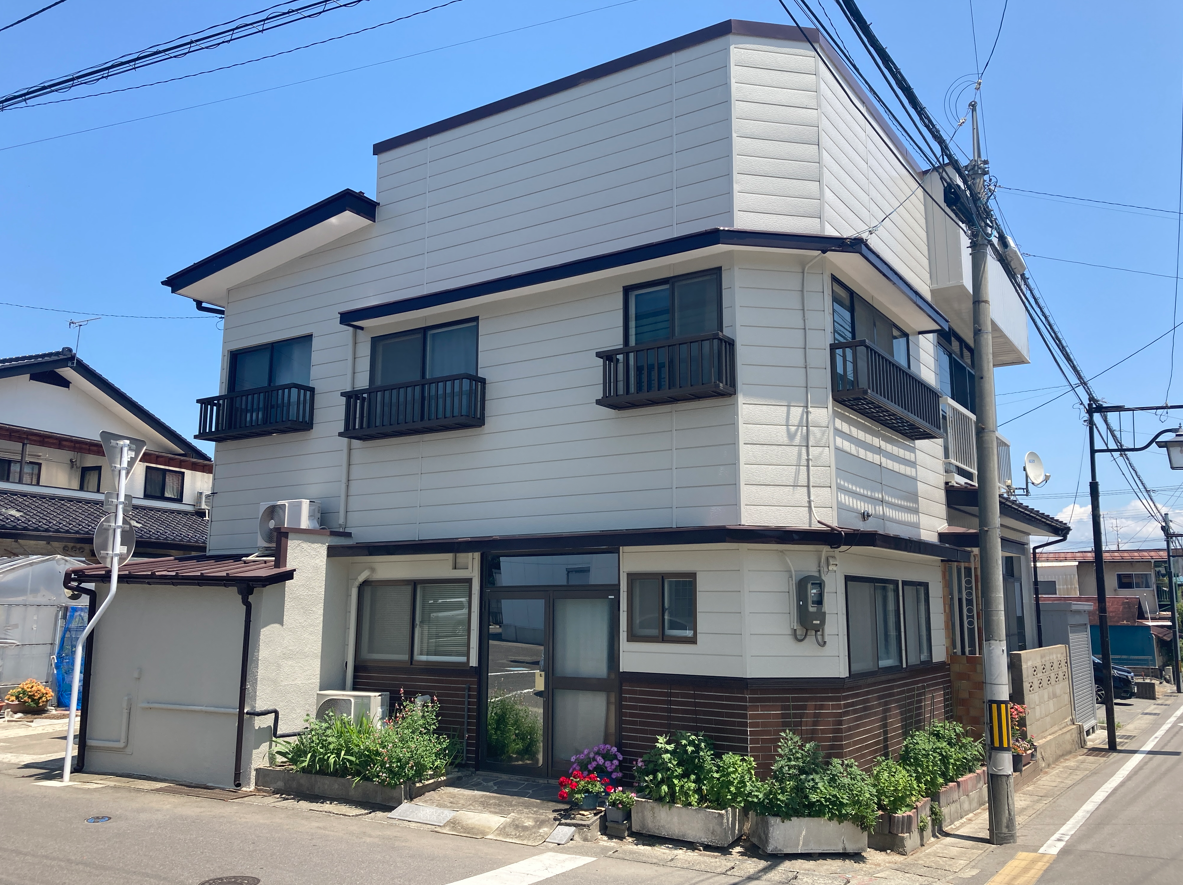 あわせて、お客様からは「美容室の廃業に伴い、庇テントを撤去して、よりすっきりした建物外観にしたい」というご要望もいただきました。既存の庇テントを取り外し、外壁塗装と一緒に仕上げることで、店舗感を抑えたシンプルで落ち着いたファサードへと生まれ変わりました。