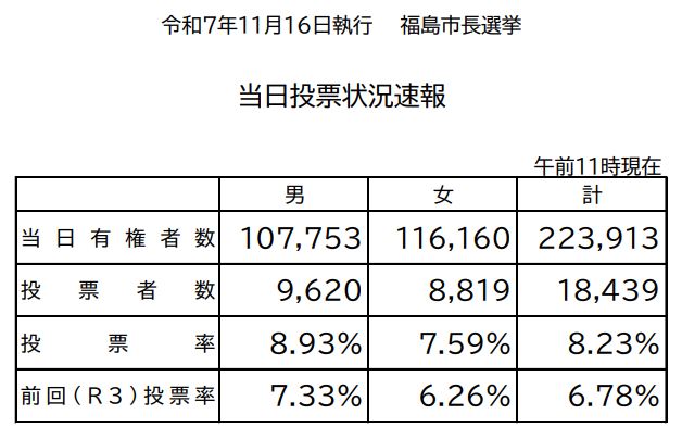 - 福島市長選挙・投票状況(午前11時現在)(ラジオ福島)- 2025.11.16(日) 11:20