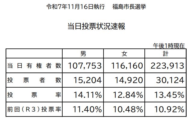 - 福島市長選挙・投票状況(午後1時現在)(ラジオ福島)- 2025.11.16(日) 13:29