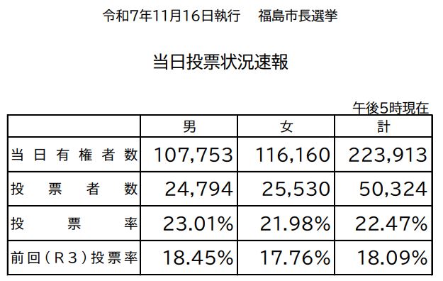 - 福島市長選挙・投票状況(午後5時現在)(ラジオ福島)- 2025.11.16(日) 17:20