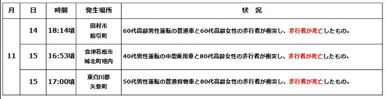 福島県内で11月14,15日と交通死亡事故が続発、3件全て「薄暮から夜間」、「高齢歩行者被害」の特徴があるほか、15日発生の2件の交通死亡事故については、「横断歩道がない道路横断中」、「車から見て右から左へ横断」などの特徴もあります。福島県警察では、薄暮・夜間における街頭指導、交通指導取締りを強化しています。交通事故に注意しましょう。