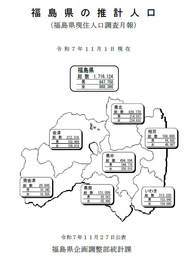 - 福島県の推定人口(11月1日現在) 1,716,124人(ラジオ福島)- 2025.11.27(木) 14:30