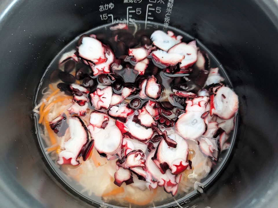 ③炊飯器に米、★の調味料を入れてから、3合の線まで水を加える。黒豆、酢だこ、紅白なますをのせて炊飯する。