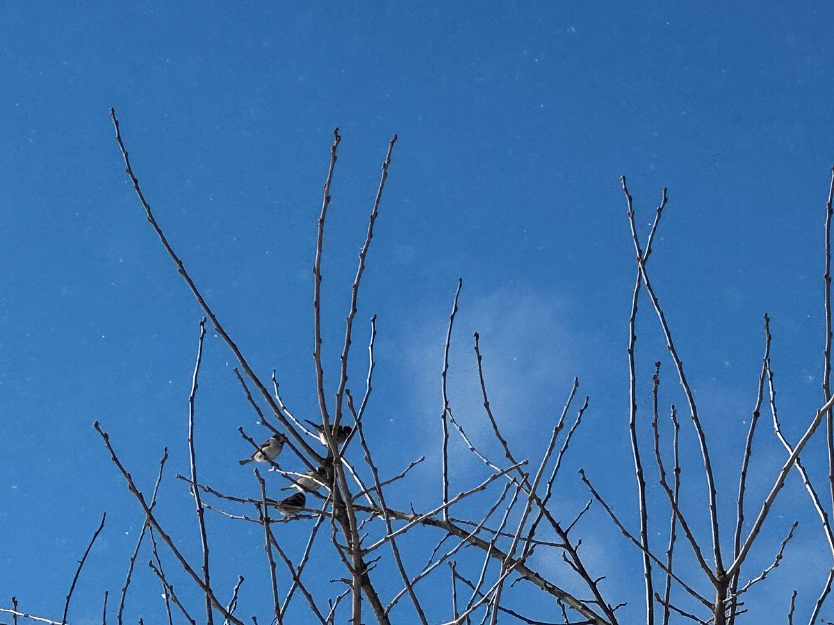 「今の会津の空です♪風が強い中、スズメ?がチュンチュン揺れる枝を楽しんでいました。